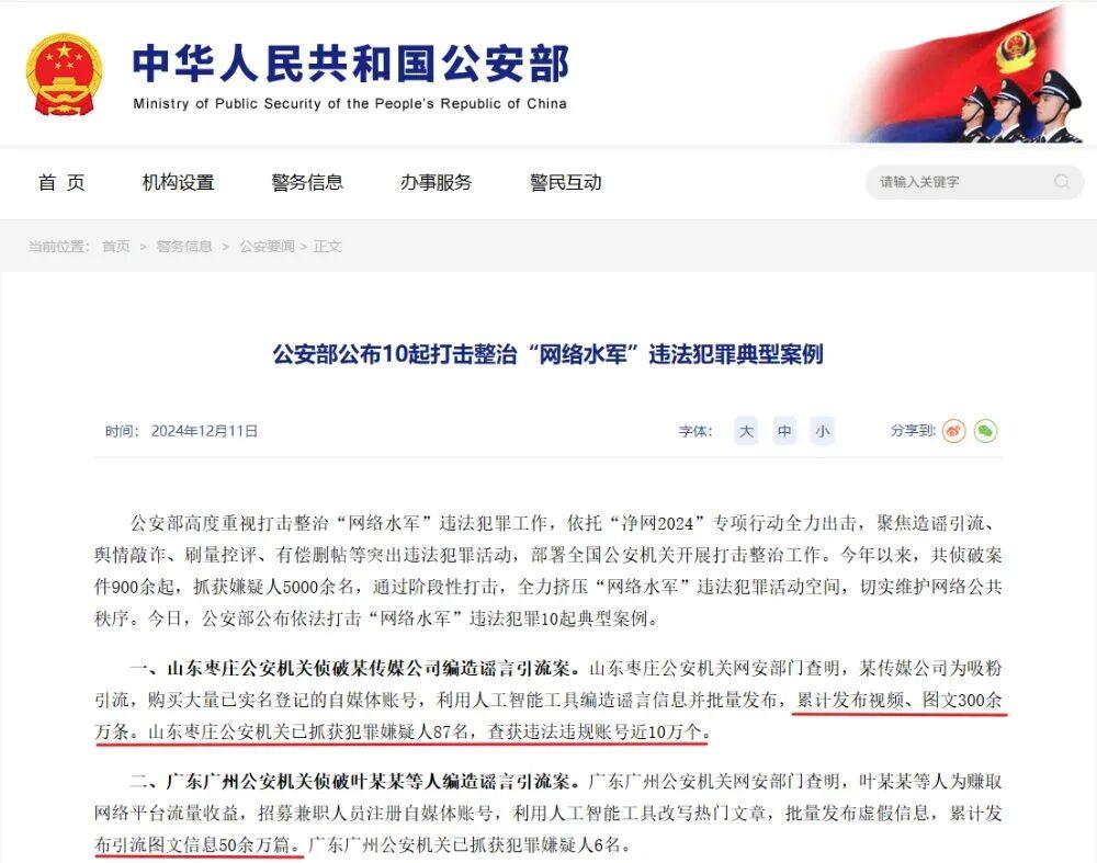截自《公安部公布10起打击整治“网络水军”违法犯罪典型案例》