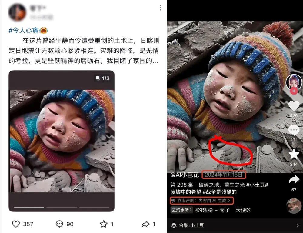 不仅是图片,AI甚至已经能做出几可乱真的视频。2025年1月初西藏日喀则市定日县发生6.8级地震,网上有很多救灾视频热传,引起了全国人民对灾区和救灾工作的关注,但其中也混进去了AI生成的内容。