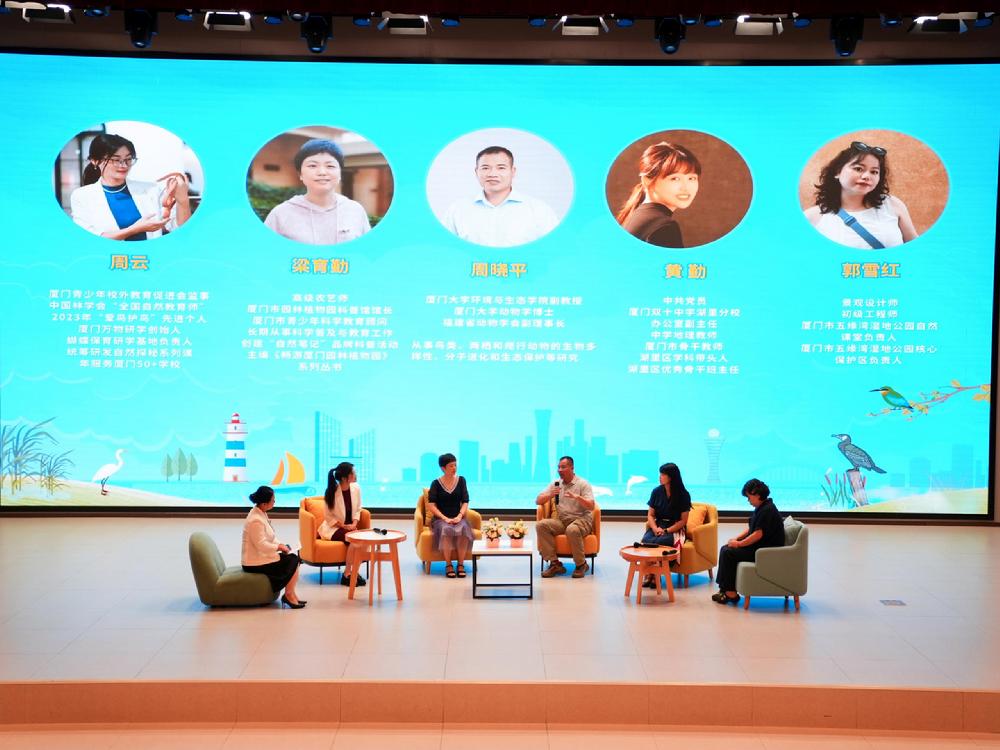圆桌沙龙作为本次论坛的亮点,围绕“城市发展与生物多样性保护的平衡之道”展开深入讨论。厦门大学周晓平副教授、双十中学湖里分校黄勤副主任、厦门园林植物园梁育勤馆长、五缘湾湿地公园自然课堂负责人郭雪红、万物研学负责人周云等五位嘉宾,分别从生态规划、学校教育、植物科普、湿地管理、研学实践等角度,探讨了如何在城市扩张中守护生态空间、推动公众参与、构建“人与自然和谐共生”的城市样板。