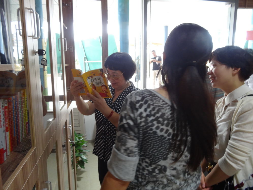 杨丽玉副主席对“鸟巢书屋的评价很高,站在书屋前,正翻开一本《五千年故事》仔细阅读着。(梧村社区 赖艳丽 肖华)