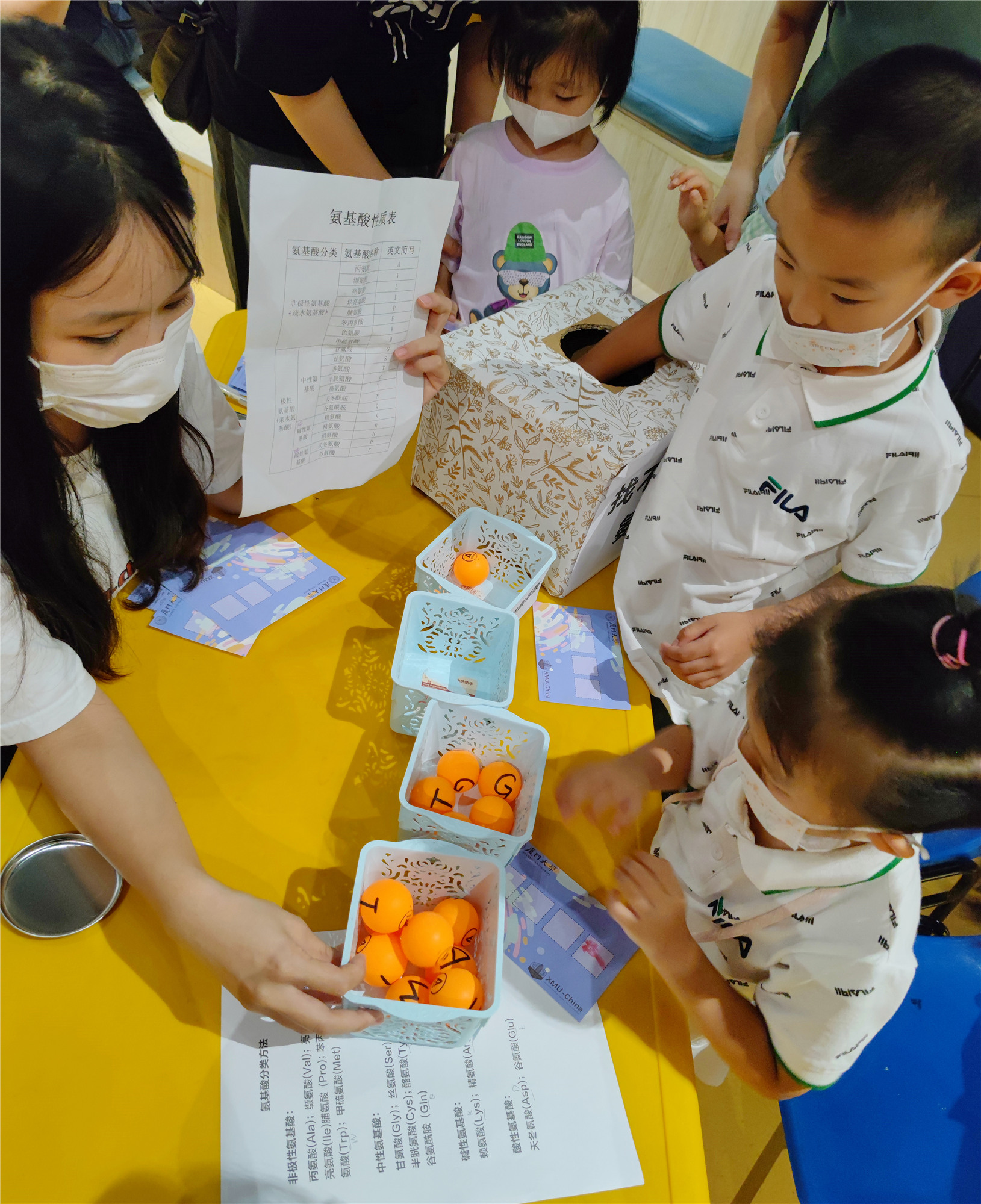 本次科普宣讲活动约有150组亲子家庭参加,活动围绕“认识氨基酸”、“分子积木”、“蛋白质卡牌”、“DNA解谜”四个模块展开,通过游戏互动、情景讲解的方式,深入浅出地为参加活动的亲子家庭详细介绍了合成生物学这一交叉学科。在活动现场,小朋友们不时提出疑问,或侧耳倾听、驻足观看,或踊跃参与、亲手操作,惊叹声不绝于耳。