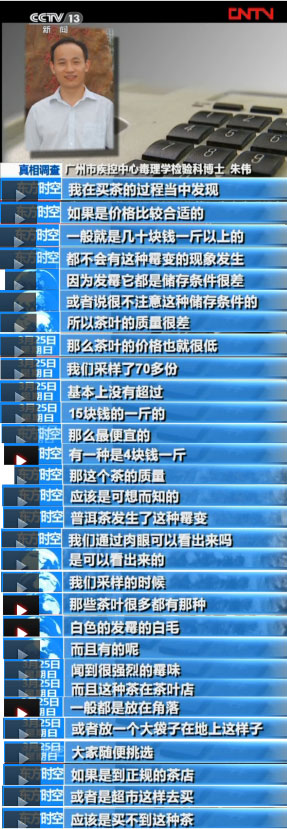 为什么要采用湿仓进行储藏陈化?因为湿度较高的地方,普洱茶会变得更黑,看上去和长年储藏的茶外表相似,可以说是一种投机取巧的手段。下图为采访广州疾控中心朱伟的一段视频截图。