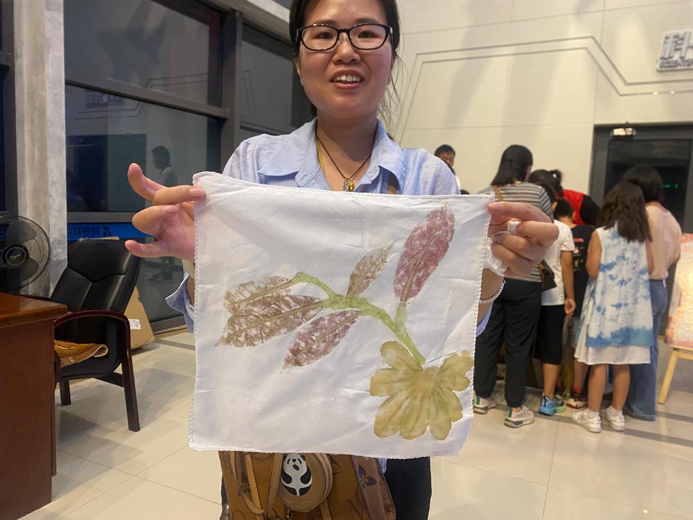“手工扎染”体验中,大家将手绢折叠、捆绑,浸入染料,待展开的瞬间,惊喜地发现每一块手绢都呈现出独一无二的纹理,直观感受到传统染色技艺的随机性与艺术性。